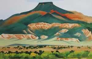 All of these elements comes together perfectly in Pedernal, painted by Georgia O’Keeffe in 1941 from her Ghost Ranch studio home in Abiquiu, NM. The Cerrillos Pedernal, which means “flint hill”, is a narrow mesa in northern New Mexico that lies on the north flank of the Jemez Mountians, just south of Abiquiu Lake. It was a popular subject of O’Keeffe’s who had her ashes scattered here. The location catches one’s breath and gently blows it away.